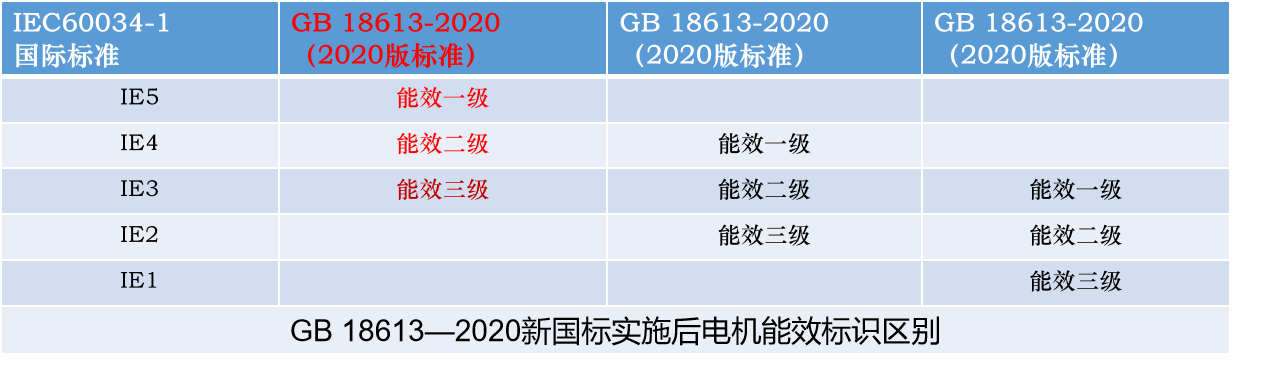 自2021年6月1日起,《电动机能效限定值及能效等级》(GB18613-2020)国家标准正式实施。新标准将IE3定为三级能效的最低标准,与国际标准保持了一致。新国标规定,低于IE3能效限定值的三相异步电动机(如YE2系列电机等)不允许再生产销售。